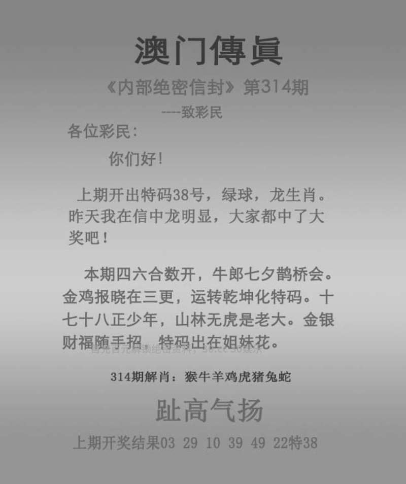 | 313期:九肖 | 蛇马羊狗牛鼠猪龙兔 | 开:龙38 |